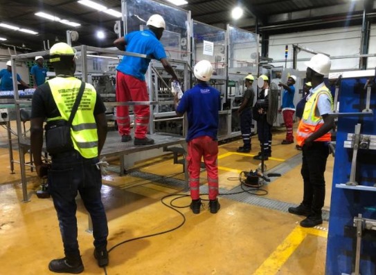 Révision annuelle de ligne SIDEL SBO8 comprenant la combi soufleuse-soutireuse-boucheuse; les convoyeurs GEBO, etiquetteuse SACMI. Manchonneuse, fardeleuse sans oublié les forages et la filtration aussi le compresseur d'air 40 BARS Atelier françois